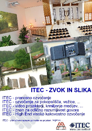 Ozvočenje za pokopališča, Diskretni zvočniki in posebej prirejena kakovost zvoka zagotavlja najboljšo razumljivost do zadnje vrstice. Nevpadljiv design. Zelo enostavno rokovanje. Ozvočevanje cerkva, slovesnostnih dvoran, mrliških vežic in pokopališč je občutljivo področje. Skupaj z vami bomo razvili koncept audio - video opreme za vaše posebne aplikacije. |